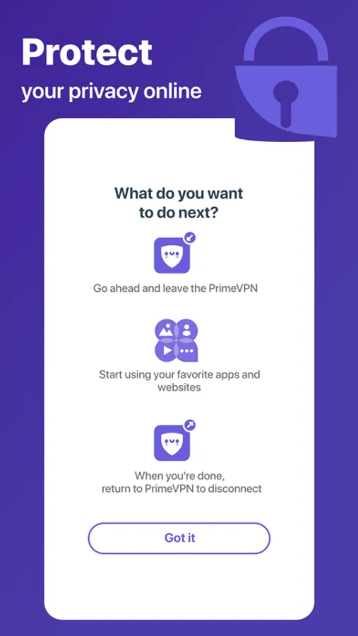 • Location Spoofing: PrimeVPN protects your IP address and masks your location from data collectors.