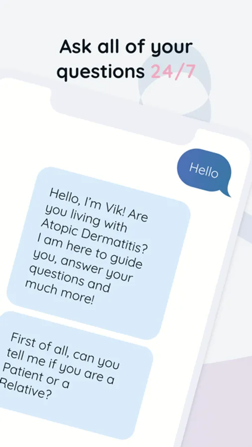 Vik Atopic Dermatitis is the health pal that helps you and answers all of your questions related to Atopic Eczema. Vik also supports your loved ones and caregivers, 24/7 (atopic dermatitis symptoms, eczema crisis, treatments...) Thanks to Vik, you will be able to better understand the disease, as well as your care pathway through personalized advice with quizzes that evaluate various parameters such as severity, required treatments, and symptom management. All of Vik's contents are based on national recommendations and are elaborated through collaboration with patients, as well as reviewed by health expert committees.