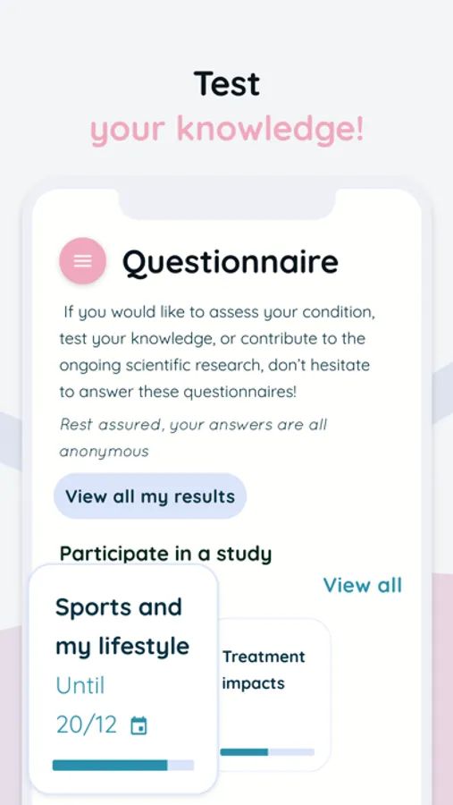 Lastly, you'll other fun and intersting ways to find out more about the disease, thourhg quizzes to test your knowledge or discuss different aspects of the illness (assessing the severity of your Atopic Dermatitis and symptoms, updating the tracking of the Eczema, seeking treatment...) or even participating in studies to contribute to the progress of the scientific research. Always know that your personal data is protected and completely anonymous. I