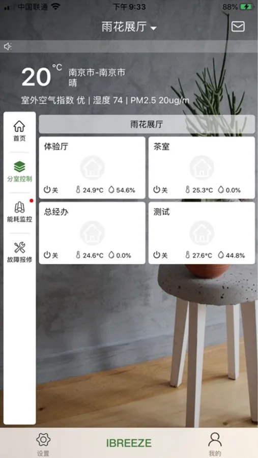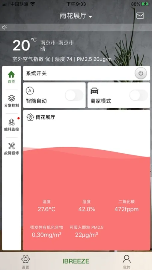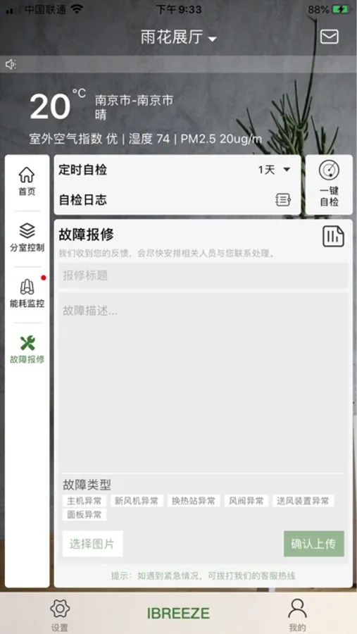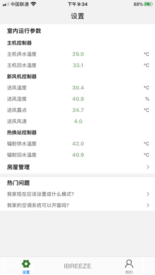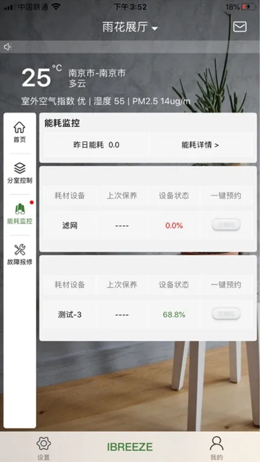 实现包括辐射空调、高温盘管系统、全空气系统等的一键控制,以及包括温度、湿度、CO2浓度、PM2.5浓度等住宅空气质量参数的实时展示。能耗监控功能可让使用者随时掌握系统的能耗指标。耗材监控、故障报修功能可实现线下服务的24小时预约。