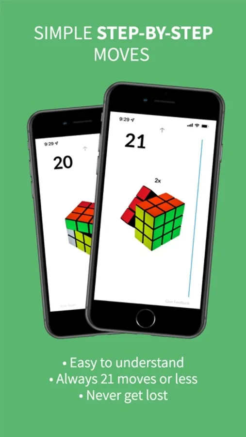 Join over 3 million cubers who have used 21Moves to develop top problem-solving and pattern recognition skills. Save hours of frustration with simple instructions guiding you to solve your cube in a matter of minutes. Improve your concentration and speed over time to show off your Rubik’s cube solving skills to the world.