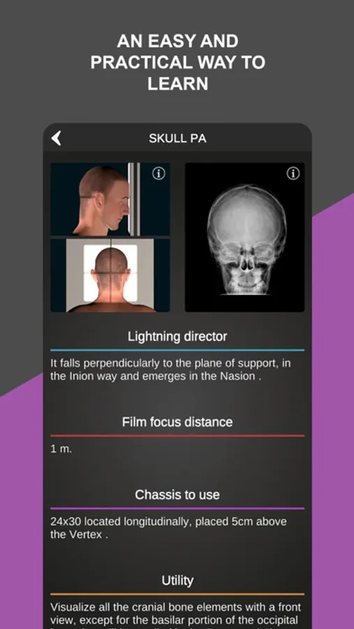 In addition you will be able to visualize examples of radiographs and the positioning of the patient, which will make your study much more visual and enjoyable.