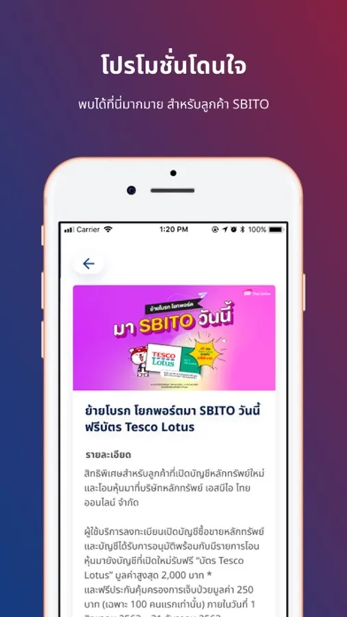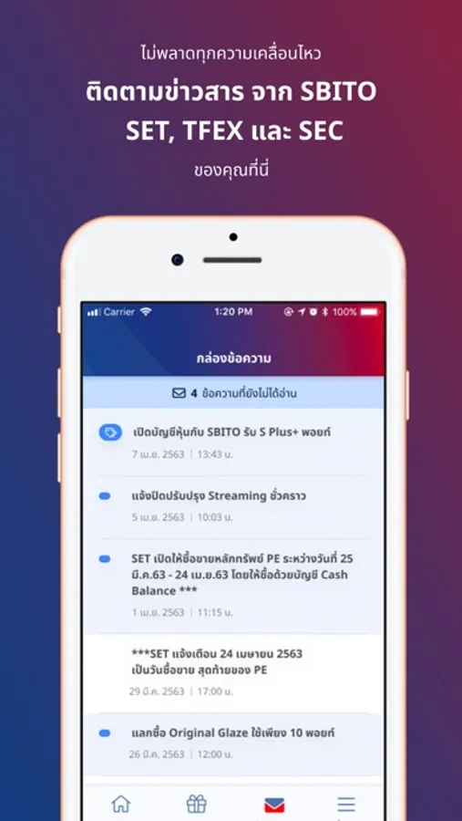 มากกว่านั้นยังเพิ่มความสะดวกสบายแก่ลูกค้านักลงทุน ที่สามารถอัพเดทข่าวสารการลงทุนและโปรโมชั่นที่น่าสนใจจาก SBITO ง่ายๆ ผ่านแอป SBITO