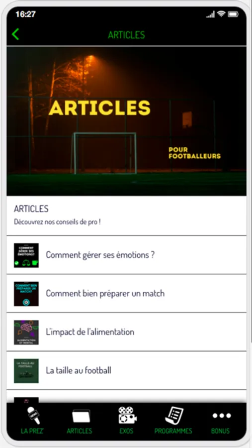 Avec l'application "L'Entrainement du Footballeur", tu pourras passer au niveau supérieur et progresser rapidement ! Tu trouveras des ressources principalement axées sur la pratique et différents aspects de l'entraînement (physique, tactique, mental...).