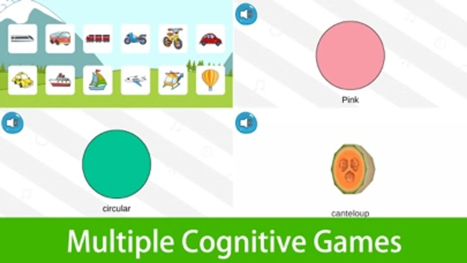 Seeing and hearing area: including knowing the vehicles, fruits, colors and shapes.