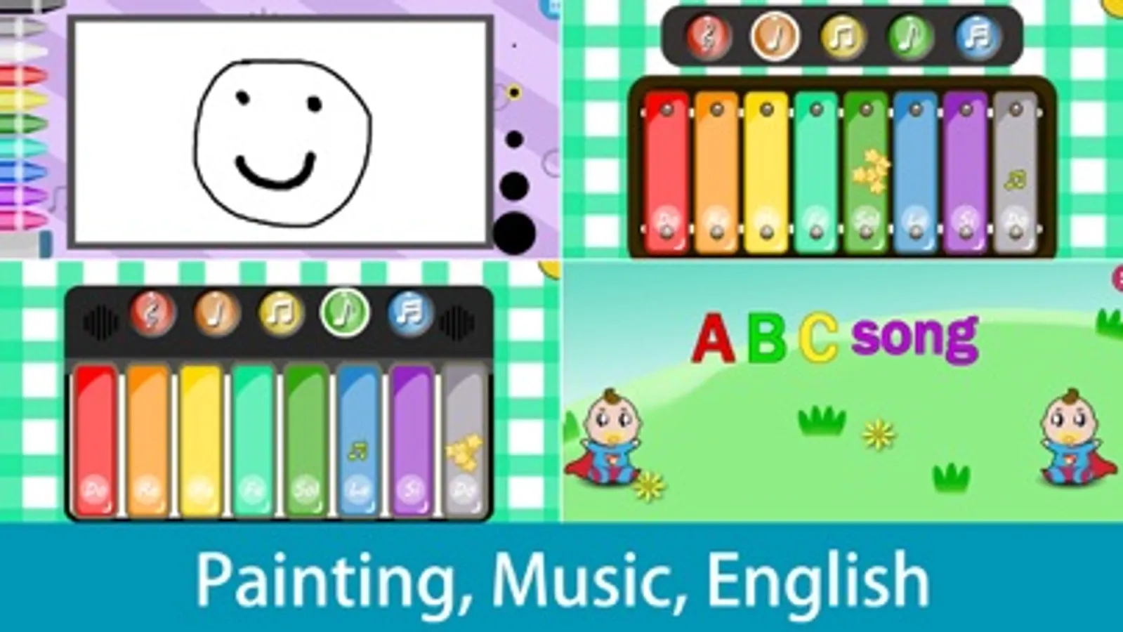 Art School: including painting, piano with eight keys, children playing by hand.
