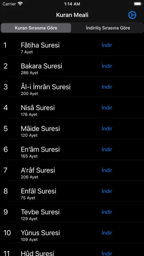Kuran Meali uygulaması ile dilerseniz sûreleri Kur'ân-ı Kerîm’deki sırasına göre ya da dilerseniz iniş (nüzul) sırasına göre dinleyebilirsiniz.
