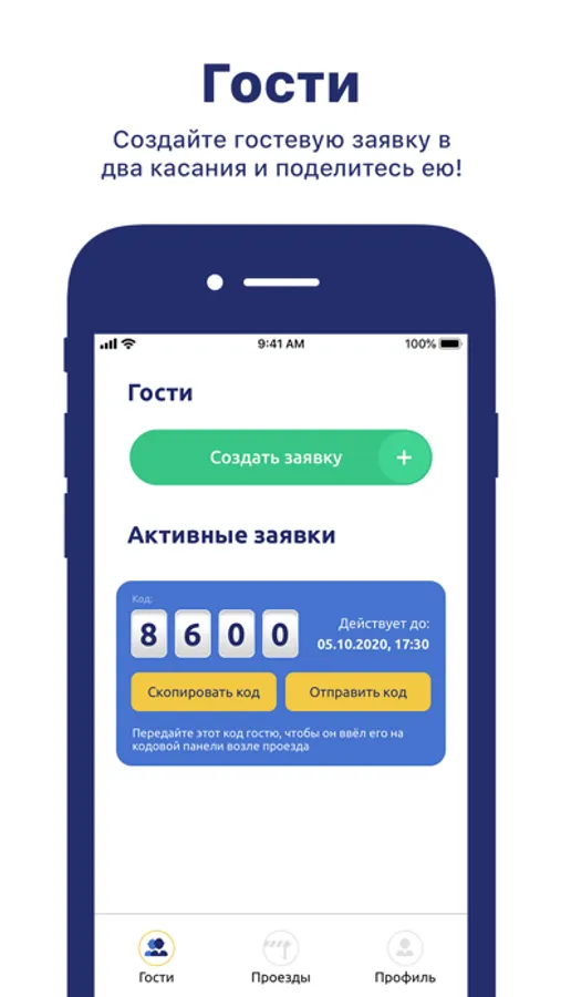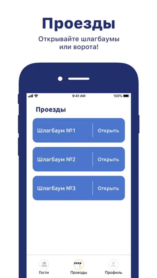Открывайте шлагбаумы и делайте гостевые заявки на проездах (шлагбаумах или воротах), подключенных к удалённой диспетчеризации Sezam.