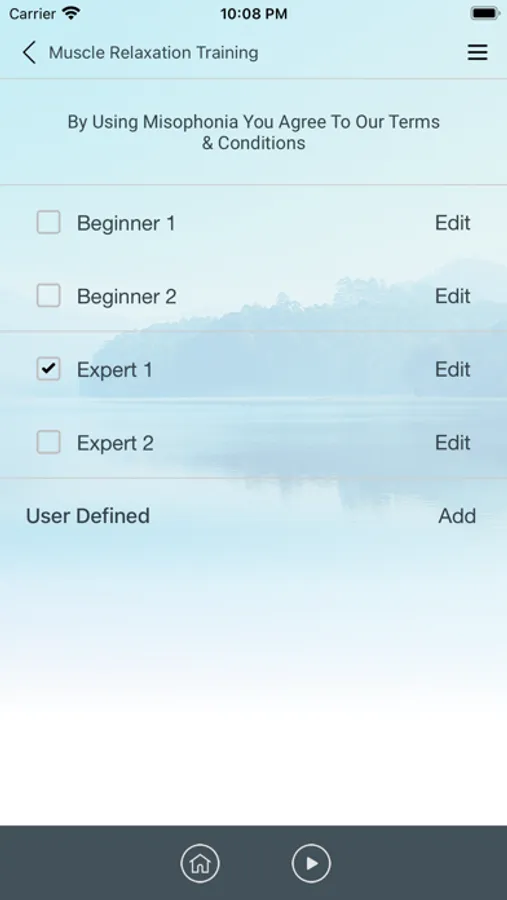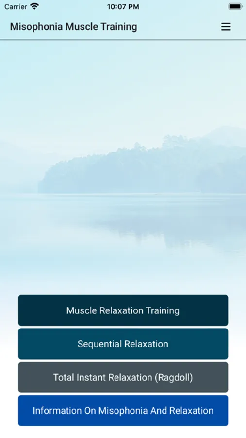 The app includes two sessions with variation in the muscles used. We suggest you alternate between these. You can select one of six music options to help you relax and one of six background noises. For a quick start to reduce your misophonia, we suggest you complete three session every day for two weeks. After 14-20 sessions, you can start Sequential Relaxation and Total Instant Relaxation (Ragdoll).