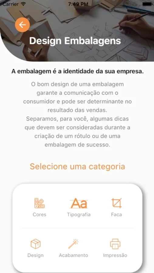 Conteúdos exclusivos com dicas de cores, sugestões das melhores tipografias, definições da faca, formatos e designs, tipos de acabamentos especiais e impressão.