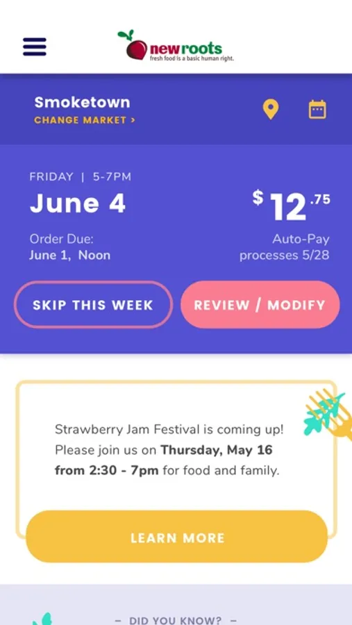 Thousands of community members are purchasing affordable, farm-fresh, organic and chemical free produce through New Roots Fresh Stop Markets. New Roots is a nonprofit food justice organization. Our vision is that everyone in our community can access the farm-fresh food we ALL need to be happy and healthy. What is special about Fresh Stop Markets is our income-based sliding scale. Everyone pays according to what they can afford: $6 for families using SNAP Benefits, $12.75 for other families facing limited resources, and either $25 or $43 for all others. This app will guide you through the process of determining where you fall on the sliding scale. Every share (bag) of produce contains 8-9 varieties of farm-fresh, seasonal, organic and chemical-free produce from our local farmers. You can also order pastured-eggs separately. The app allows you to choose your market location and lets you know the date and time for pick up and/or delivery. We have seven biweekly markets to choose from. Each market pops up biweekly. Over a 22 week growing season, you will receive 11 bags. All you have to do is put in your payment (SNAP Benefits or Credit/Debit) and the system will automatically charge you up front, two weeks in advance of your pickups. You can also access plant-based, healthy recipes and stories from the New Roots blog, as well as receive updates on happenings including new cooking videos, farm tours, and other fun events. Remember, New Roots is a small, grassroots nonprofit organization, we are not a big store. By signing up for your share, regardless of what you pay, you are helping your neighbors eat well and uniting communities to spread food justice across the land. Enjoy this app and may all of your plates always contain fresh produce, at least half.