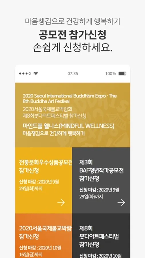 불교박람회 모바일앱 통해서 더욱 스마트하고, 편리하게 전통불교산업 및 문화, 예술을 즐겨보세요.