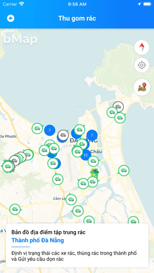 - Bản đồ xe rác và địa điểm tập kết rác: Giúp gửi thông báo về thùng rác đầy, gửi góp ý về dịch vụ thu gôm rác.