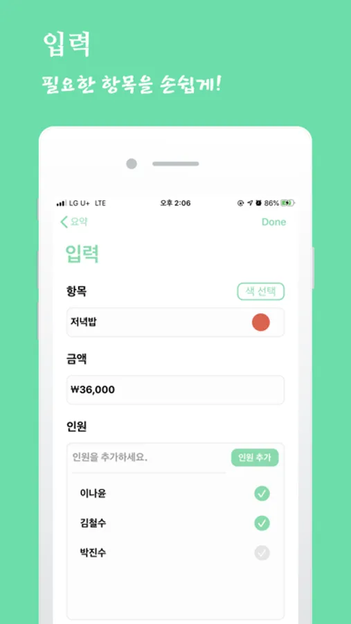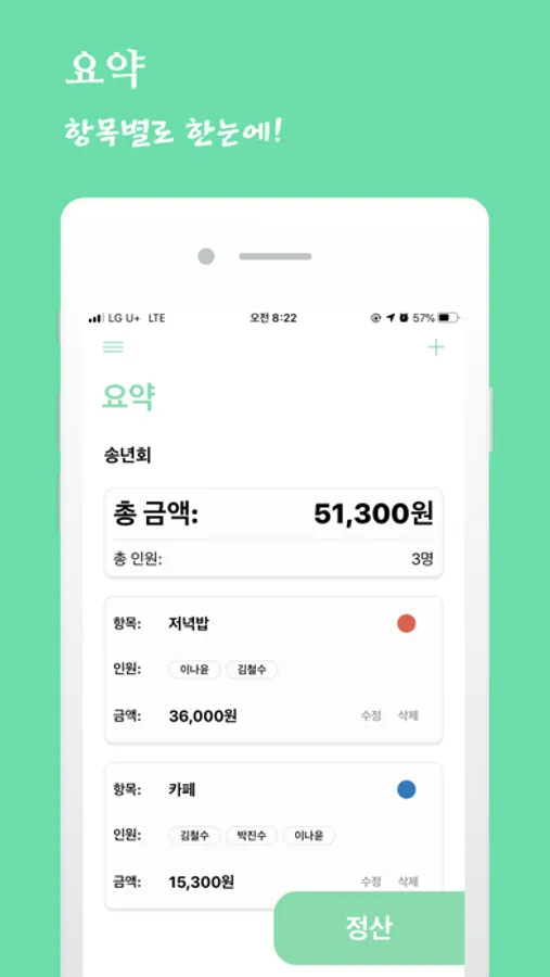 2. 각 지출항목에 색상태그를 사용해 정산시 누가 어느 항목에 참여했는지 쉽게 구분이 가능합니다.
