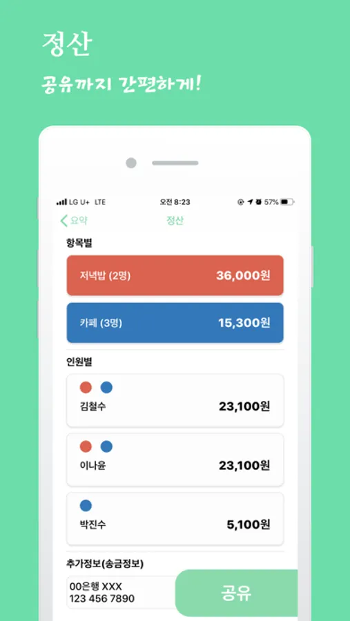 3. 공유하기 기능은 정산화면에 있는(한 화면에 담기지 않은 항목을 포함한) 모든 정보를 이미지로 만들어 공유받는 친구들이 쉽게 정산내용을 볼 수 있습니다.