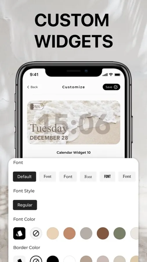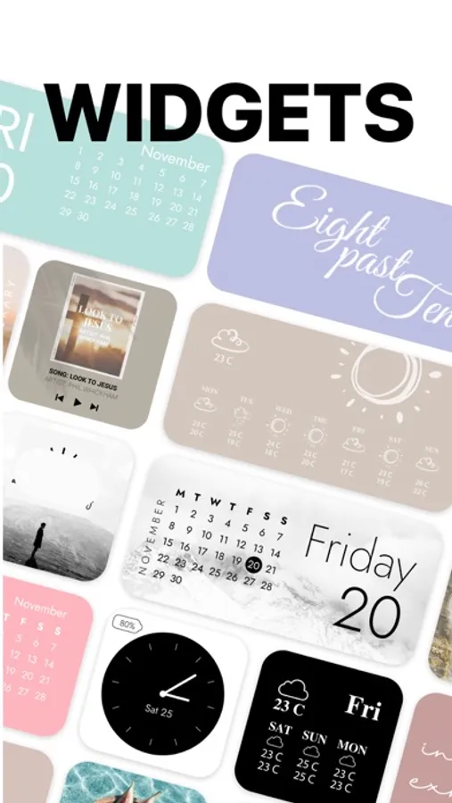 Whether you want to add all-ready made widgets or create a widget from scratch using our templates, it’s all possible in ScreenKit. Explore our collection of Weather, Date, Clock, Calendar, Bible, Motivation, Battery, Countdown and Photo Widgets. There are 1000’s of widgets in every aesthetic. Enter the widget customisation mode to easily change the style of text, background, appearance, colors, decorations & much more.