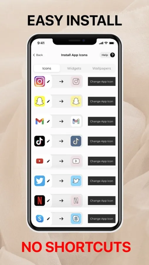 Inside ScreenKit, you’ll find hundreds of app icon packs including anime, minimalist, classic, neon, abstract, pastel, glitter, sports, scrapbook, nature, boho, kawaii, gold, retro and much more. All our app icons are carefully created to provide high-quality graphics for our users. Install all the app icons at once. It only takes 2-3 minutes to install a theme.