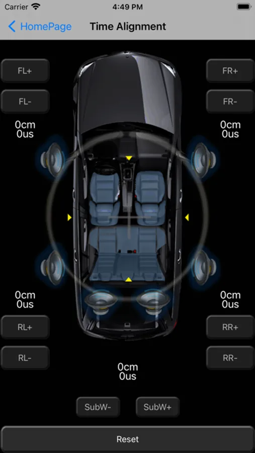 • Time Alignment in cm (0 – 230cm) for front, rear and subwoofer channel