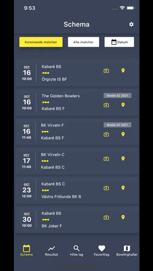 Håll reda på när kommande matcher är för dina lag, se resultat och få hjälp med att hitta bowlinghallen eller varför inte kika direkt från livescoring!