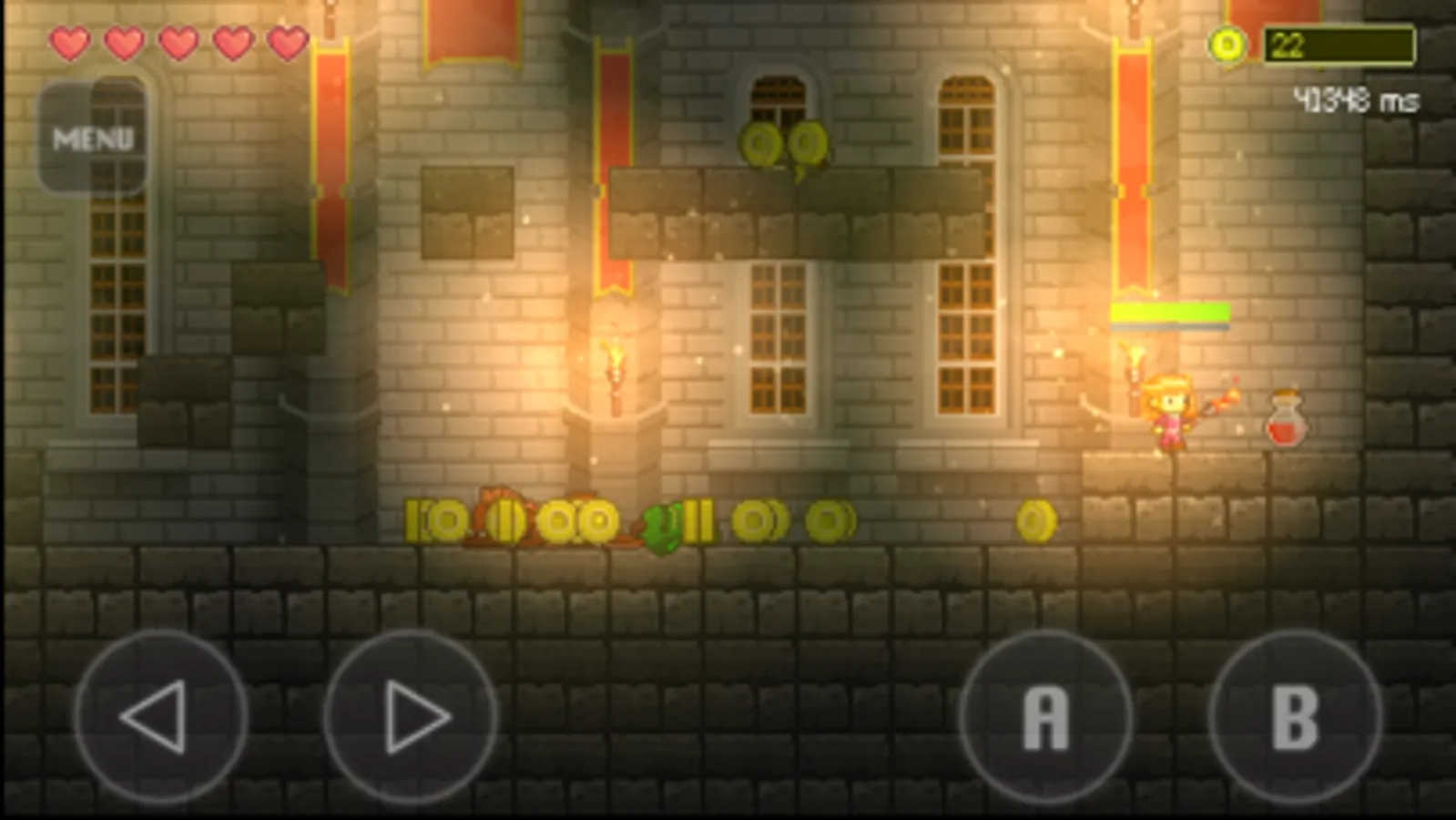 Nine stages with different environments. The princess must guide her way through unknown lands, enemies and traps to make it to the end of each stage.