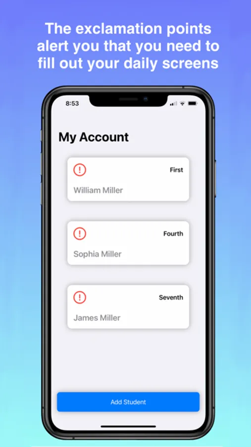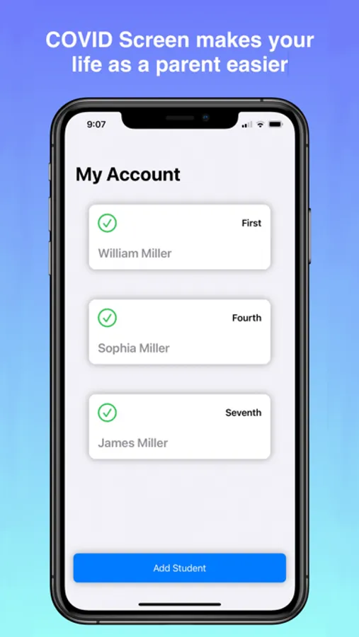 Your family will have a page that displays all of your kids profiles which allows you to quickly submit the screen within seconds each day. The app is built for efficiency and simplicity; it is designed to make each morning just a little bit easier for you.