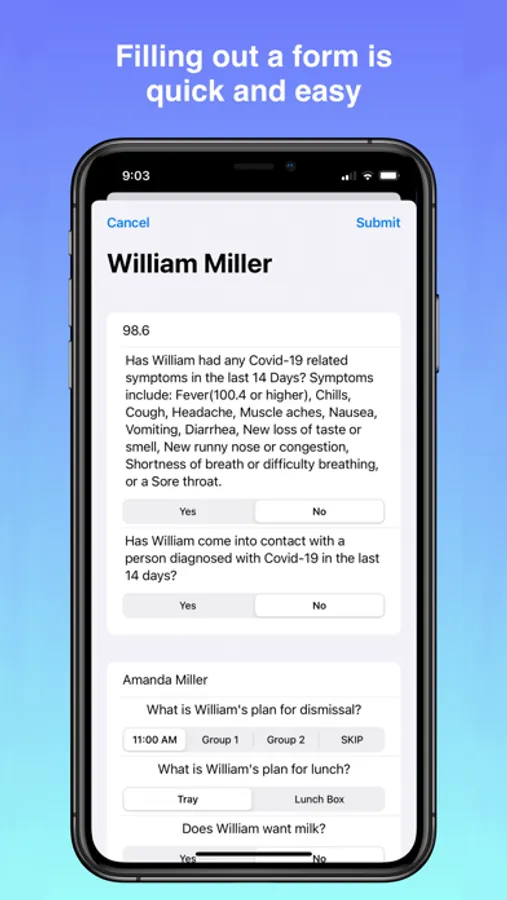 Covid Screener makes your chaotic mornings as a parent easy. It allows you to quickly fill out a screen and submit it to the school each morning to ensure the safety of your child at school. This app will allow the school to minimize the risk of an outbreak and more easily track the health of their students.