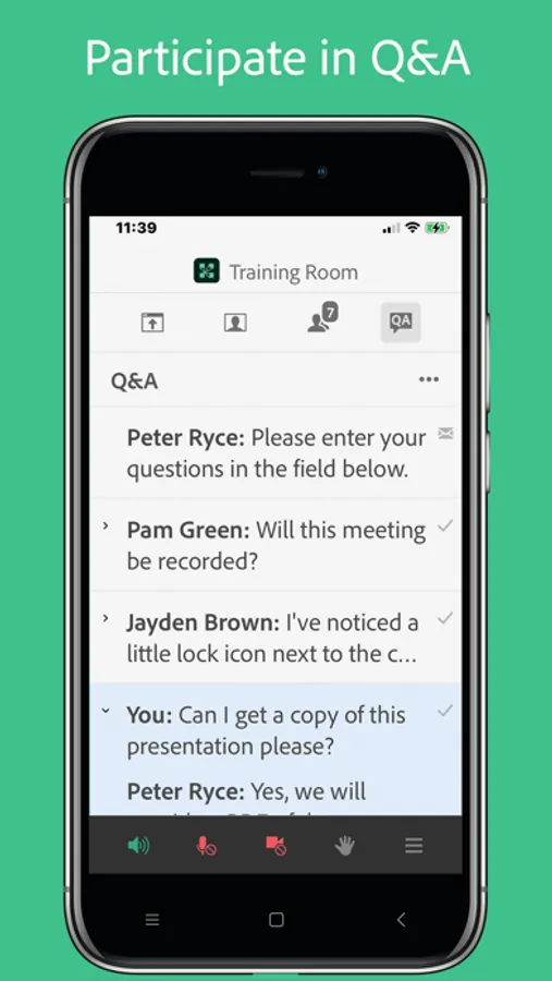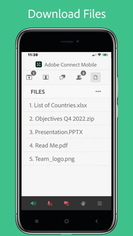 Use your built-in microphone and speakers, a connected headset, or a Bluetooth device such as Apple AirPods to join meeting audio. Or join a telephone conference if included with the meeting. Participate in video conferencing using your device’s cameras. View high quality PowerPoint® presentations, videos, PDF documents, images, GIF animations, or desktop computer screens being shared. Participate in chat, vote in polls, read notes, download files, click links, ask questions, raise your hand, agree/disagree, or let the host know you have stepped away.