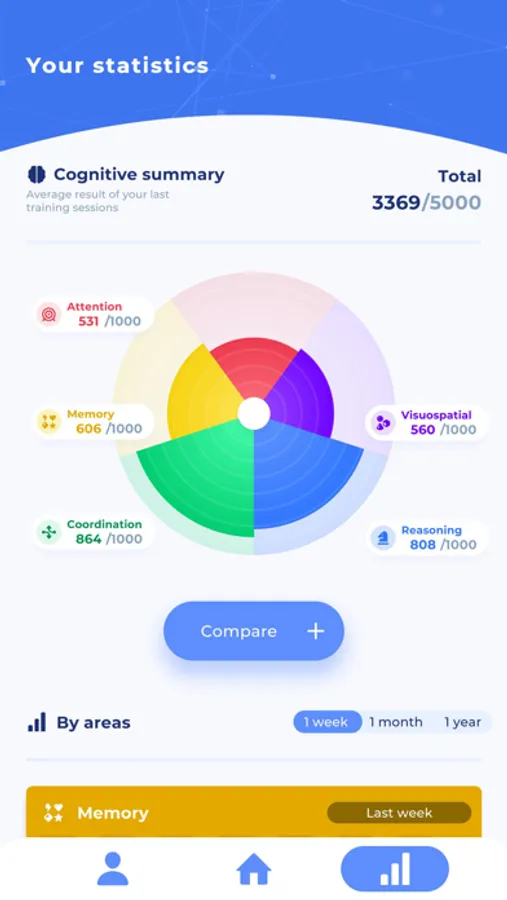 Focus - Train your brain has a statistics section where you can see your cognitive evolution during the last week, month or year. In addition, the app offers you a cognitive summary in which the average scores of the results of your daily workouts are shown.