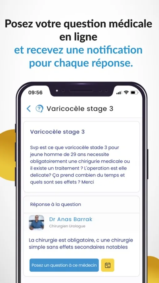 4- Questions médicales: Doute, inquiétude ou besoin d'aide, posez votre question médicale en ligne en toute sécurité directement depuis l'application et recevez une notification instantanée pour chaque réponse. Des centaines de médecins sont prêts à vous répondre.