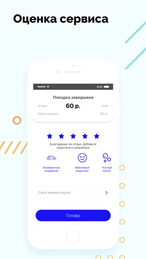 Поставьте хорошую оценку водителю, чтоб повысить его рейтинг. Добавьте его в список “Избранное”, чтобы в будущем вызвать именно этого водителя