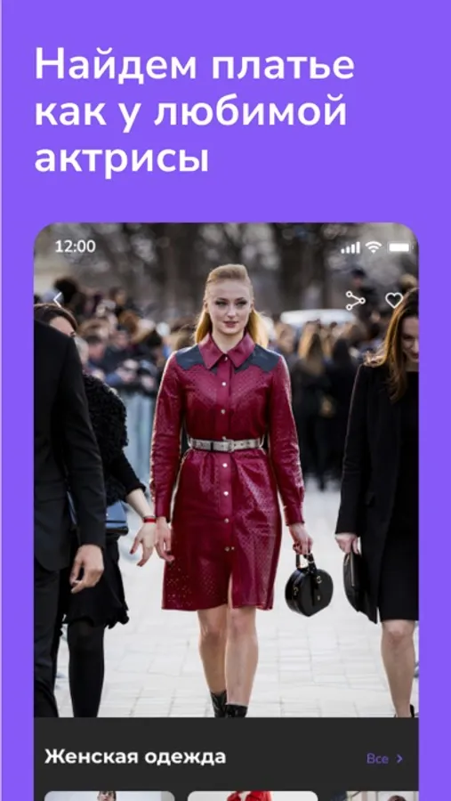 делайте фото с помощью приложения или загружайте картинку из медиатеки и узнавайте где купить похожее платье или сумочку.