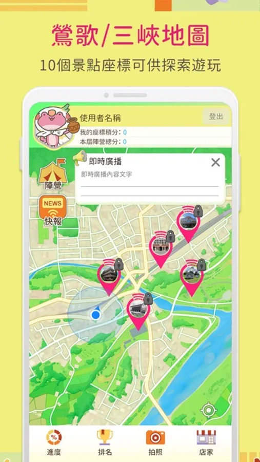 地圖上共有10個座標,分別為鶯歌火車站、成發居、鶯歌老街、三鶯之心、鶯歌博物館、李梅樹紀念館、愛鄰醫院、三峽拱橋、三峽祖師廟、三峽老街,座標謎題闖關完成,就可以收集到可愛的蛙蛙徽章喔!