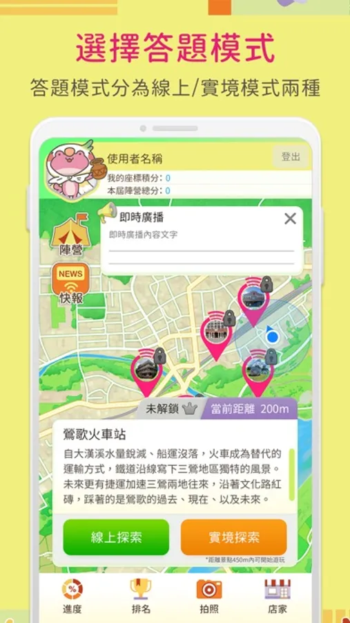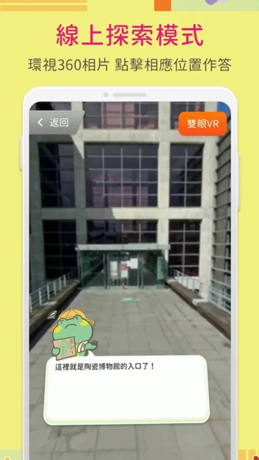 透過手機中蛙蛙們的引導,步行三鶯實境探訪;即便身處異地也可以透過VR模式,一覽三鶯人文面貌!更藉由座標上逗趣的謎題深入瞭解三峽鶯歌。