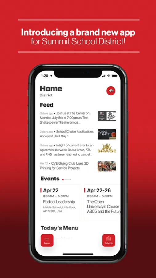 The event section shows a list of events throughout the district. Users can add an event to your calendar to share the event with friends and family with one tap.