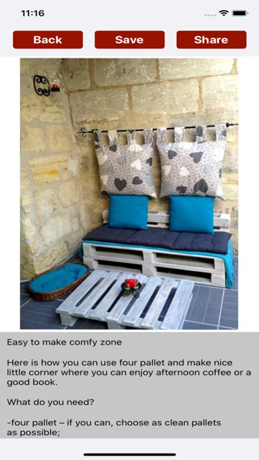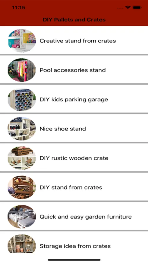 Over three dozens diy pallets and crates ideas are available in this app – storage space idea, worktable for your garage, comfortable sofa with cushions and many more. If you need storage space, then you will love diy crate ideas included in this app.