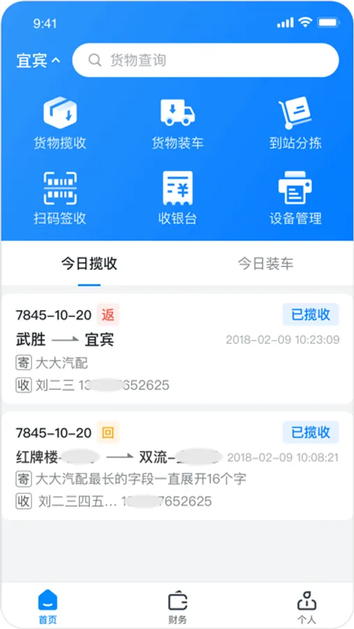帮助揽收员、派送员、管理者等角色处理:揽收、装车、分拣、派送等工作,并与PC端云管理系统数据实时同步。