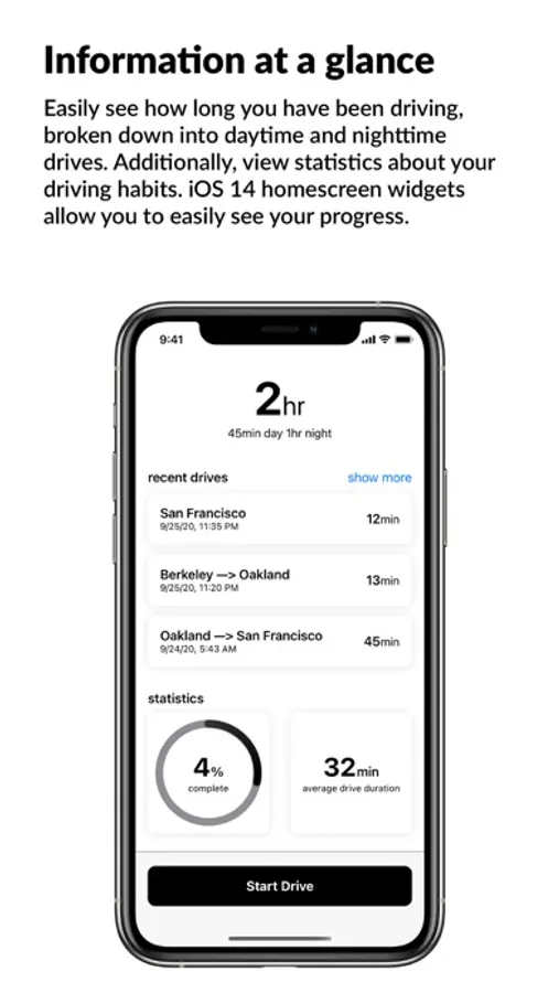 Easily see how long you have been driving, broken down into daytime and nighttime drives. Additionally, view statistics about your driving habits. iOS 14 homescreen widgets allow you to easily see your progress.