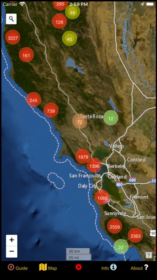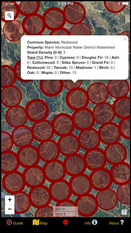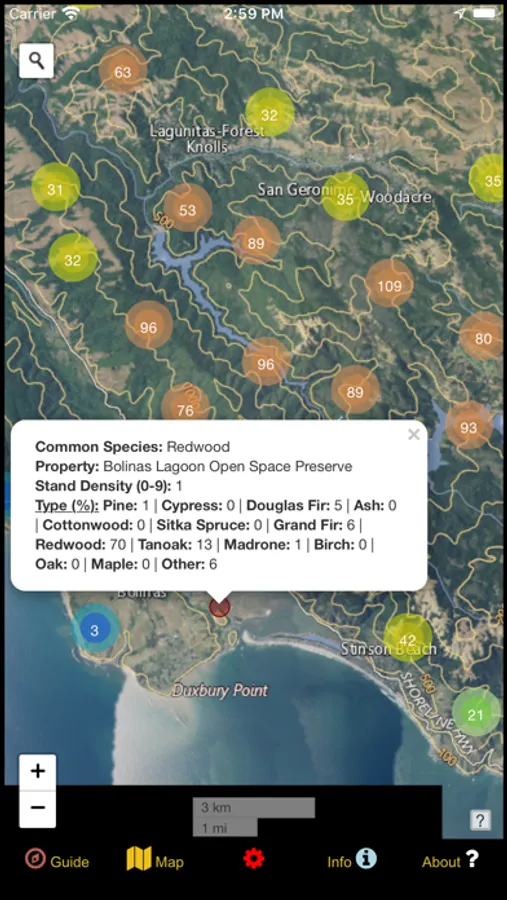 In addition to defining the link between trees and mushrooms, this app goes one step further. An inventory of millions of data points from forest stands across the state has been filtered and processed to clearly highlight specific areas that have the highest probability of yielding a harvest of mushrooms. These circular polygons are color-coded by species and attributed with useful information such as tree family and tree density, along with land unit name, so you can quickly differentiate between tree types in the map view and target the best areas to search. Indicator species referenced include Pine, Cypress, Redwood, Sitka Spruce, Grand Fir, Douglas Fir, Ash, Cottonwood, Oak, Maple, Tanoak, and Madrone. Even burn areas are included to help find Morels!