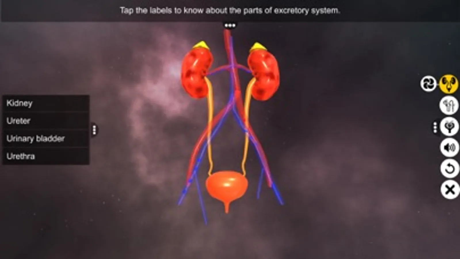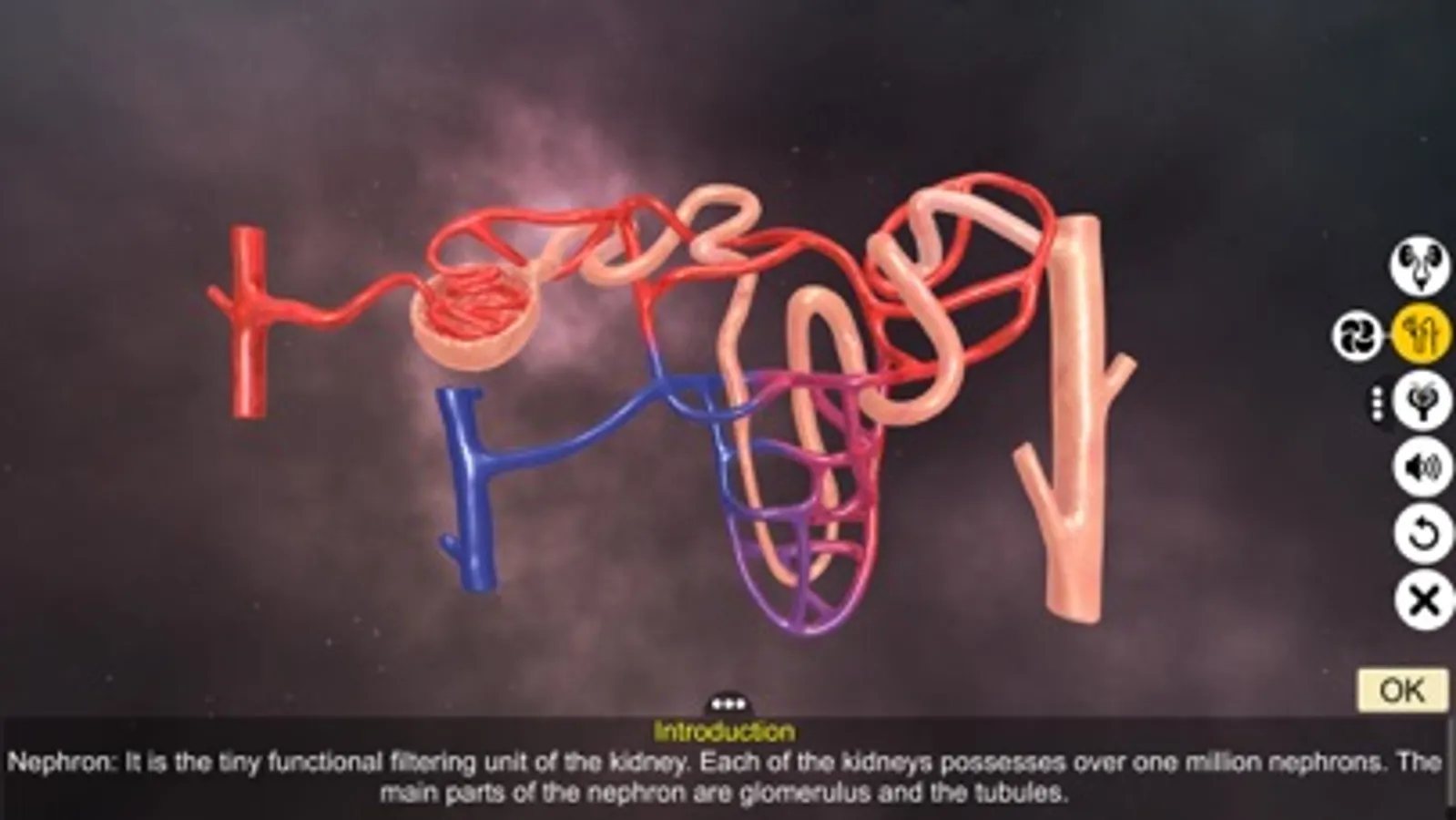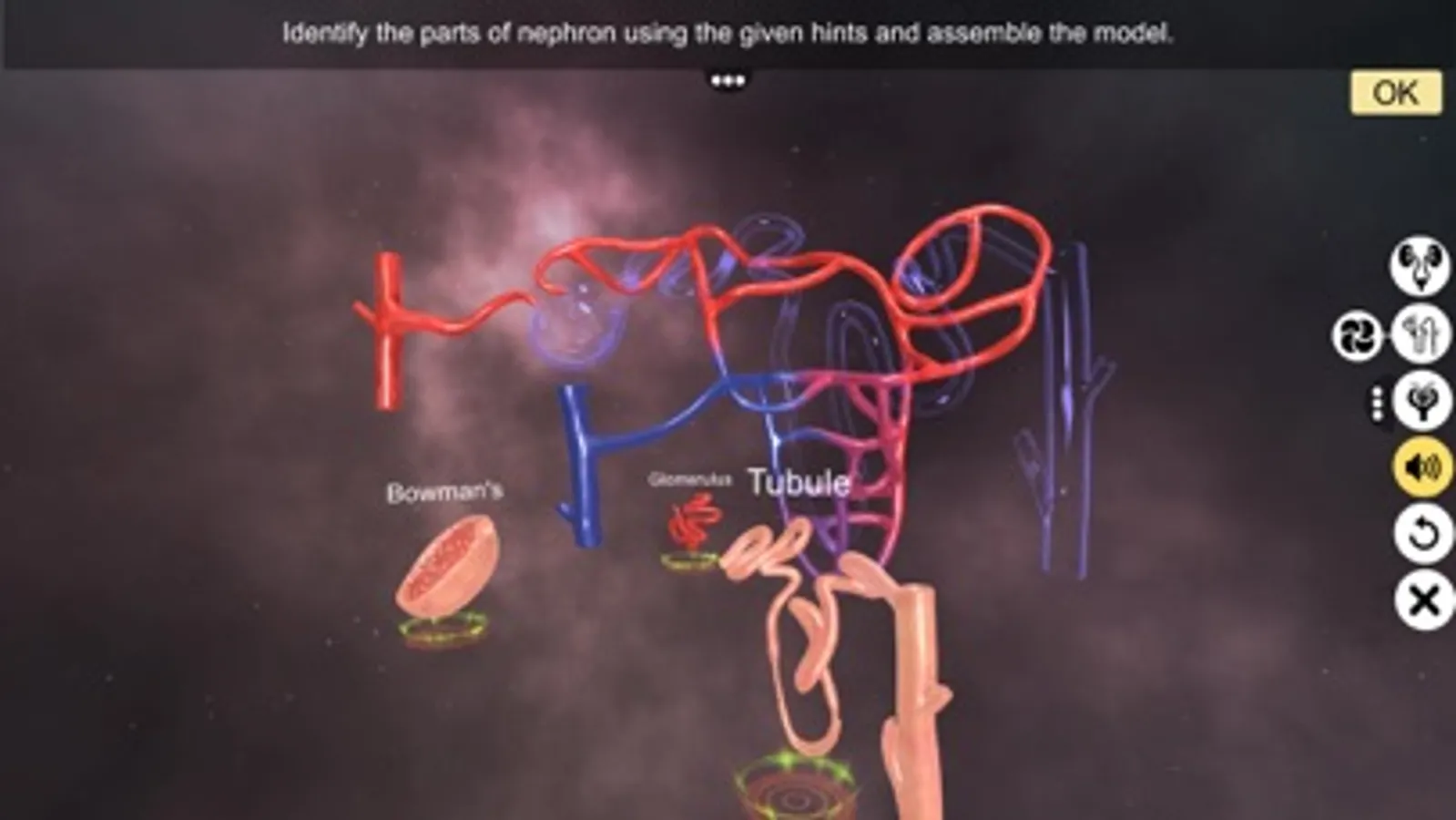Structure and function of the urinary system, internal structure of the kidney and nephron is very well supported with information in the form of descriptions and 3D models of the organs. User can have a quick check of the concepts learnt at various levels, by dragging the virtual parts of the organs and dropping them to their apt positions. Also the user can simulate urine formation in the nephrons. This effectively helps to elucidate the process.