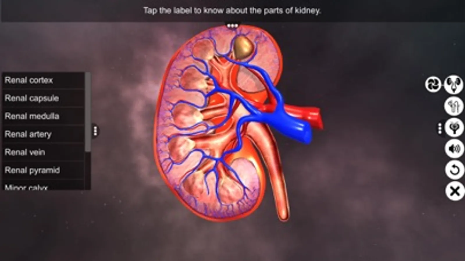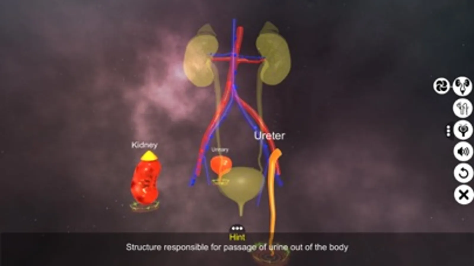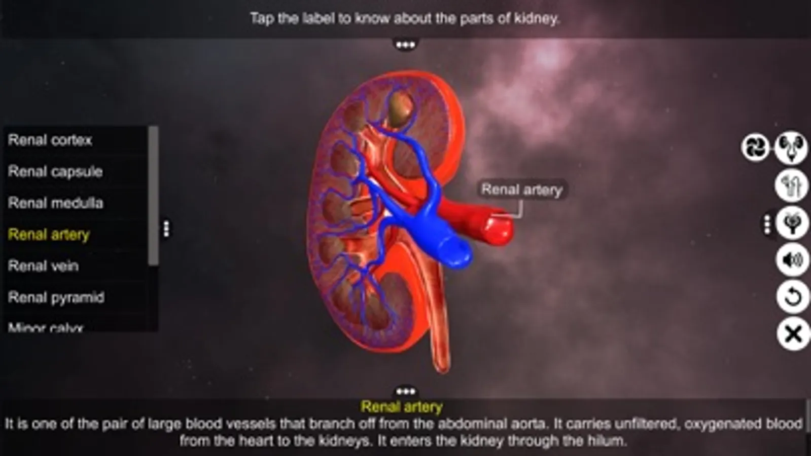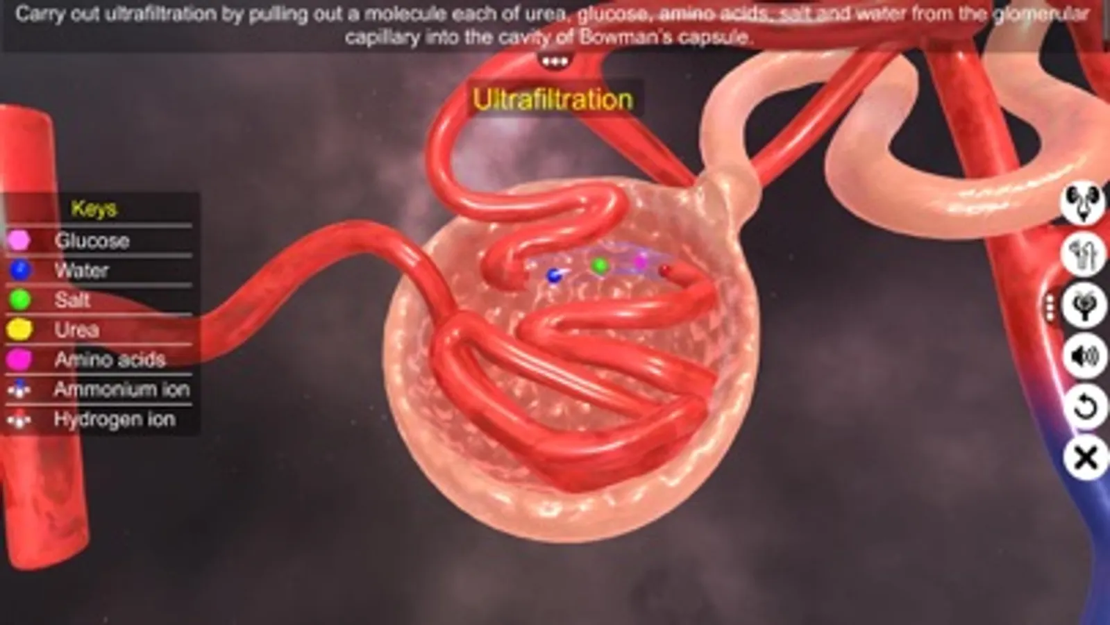 Structure and function of the urinary system, internal structure of the kidney and nephron is very well supported with information in the form of descriptions and 3D models of the organs. User can have a quick check of the concepts learnt at various levels, by dragging the virtual parts of the organs and dropping them to their apt positions. Also the user can simulate urine formation in the nephrons. This effectively helps to elucidate the process.