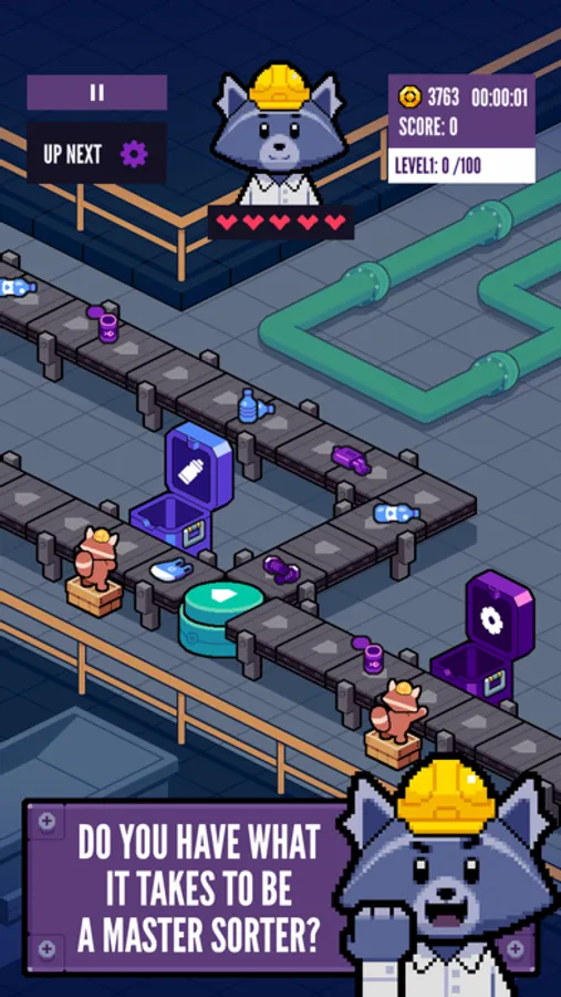 Think of this game as a kind of Tetris, but with trash, conveyor belts, and raccoons with hard hats!