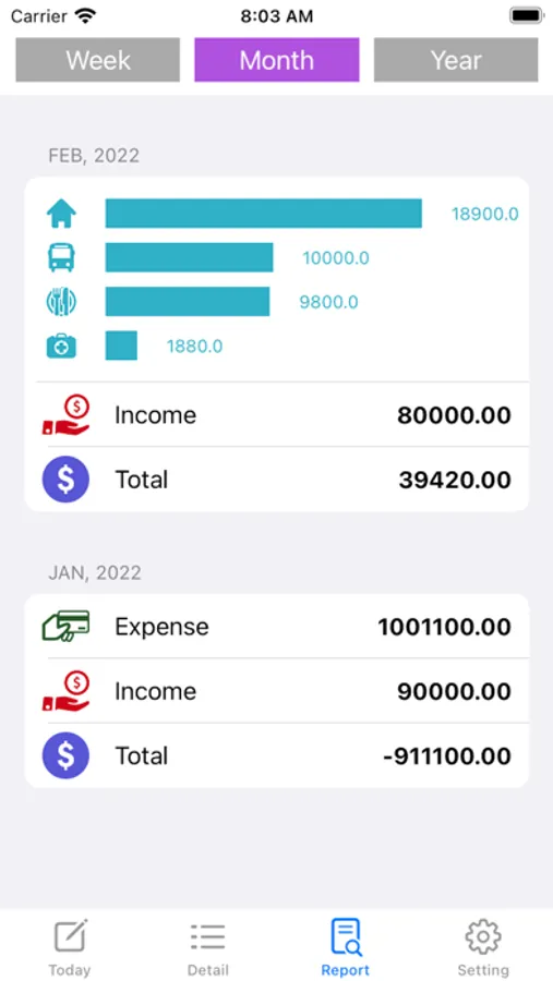 4. Graphical report, you can view the classification of income and expense by week, month and year.