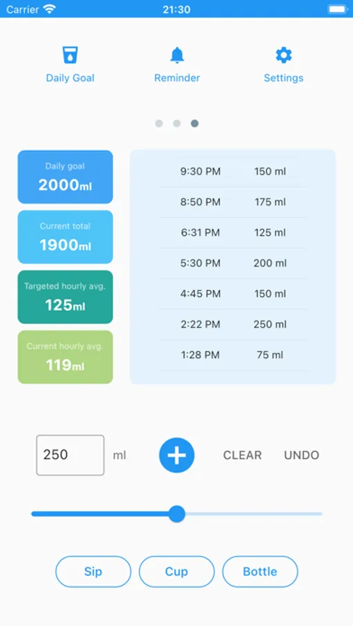 • Smart reminder only sends out notifications when logged water intake rate is below targeted hourly rate