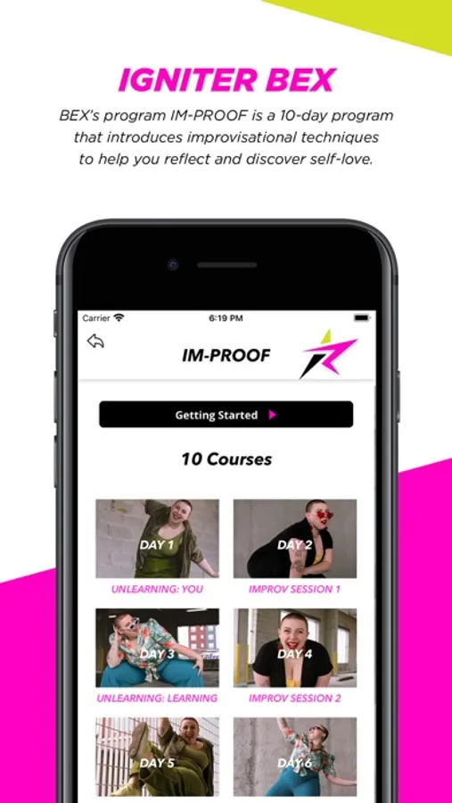 Ignitor BEX is a professional dancer and Popular Social Media Influencer. Her 10-day program IM-PROOF will help you discover SELF-CARE and SELF-LOVE through the art of IMPROVISATION and MOVEMENT. Through her spunky energic style, BEX will help you UNLEARN YOURSELF. All sessions are an average of 30-minutes with minimal equipment.