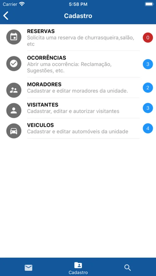 2. O usuário terá acesso a todos os dados cadastrais, de todos os usuários cadastrados em suabunidase (divididos nas categorias MORADORES, VISITANTES e FUNCIONÁRIOS), bem como dos veículos vinculados.