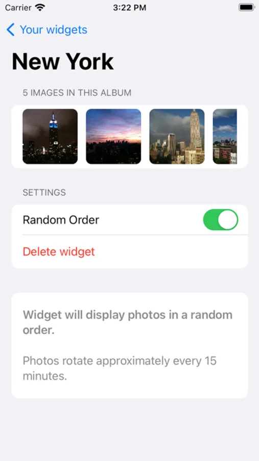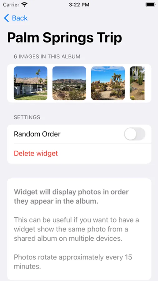 Display photos random order or a non-random order that is great for seeing the same photo as other folks in a shared album.