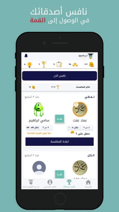 يمكن للطالب أن يقوم بمنافسة احد زملائه في الجزء الكمي أو اللفظي أو كلاهما معا .. وتلك وسيلة لربح المزيد من النقاط واضافة المرح للتعليم.