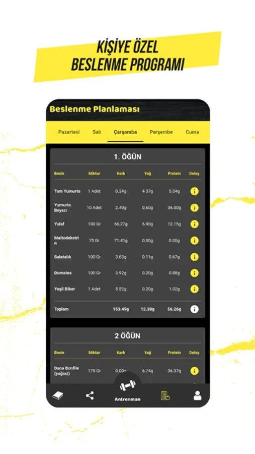 Teamevrekli app; programa kayıt olan üyelerin beslenme antrenman kardiyo ve supplement planlamalarının gösterimini sağlamaktadır...