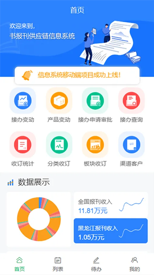 书报刊供应链信息系统移动端,进行移动快捷审批,数据报表移动展示