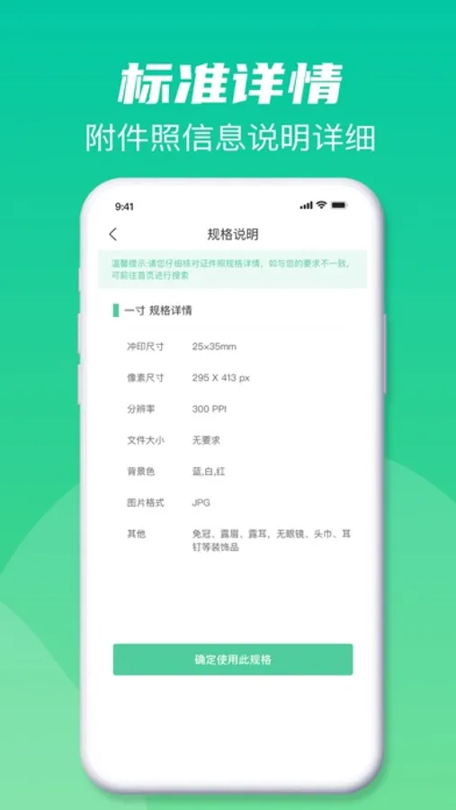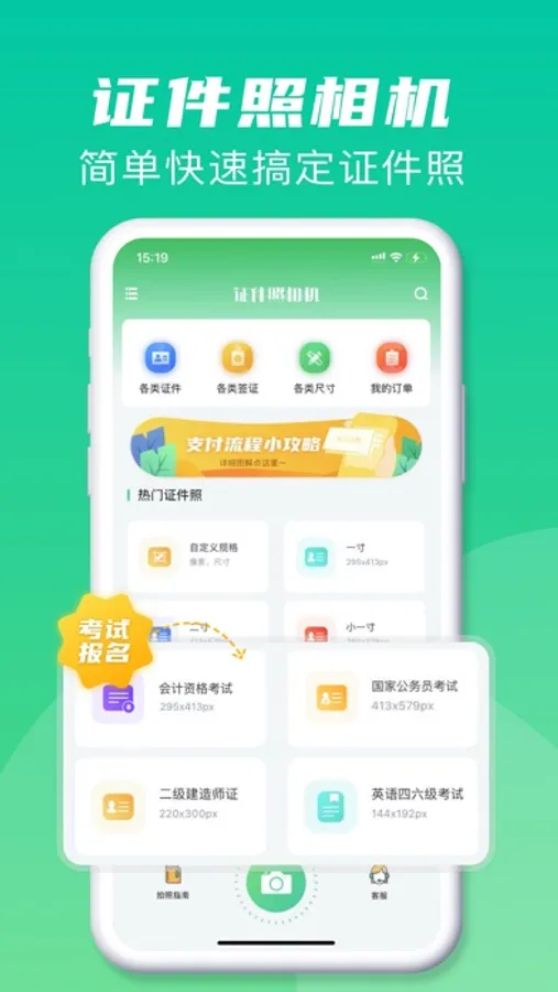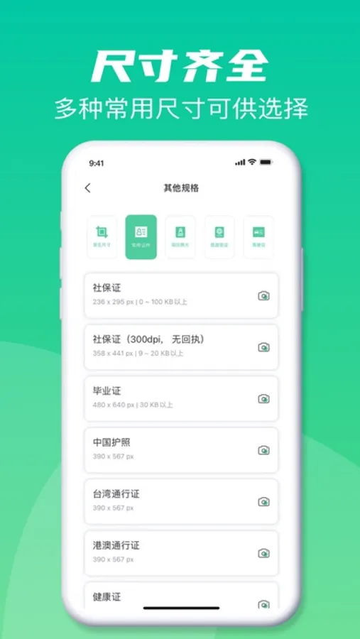 简历照片、岗位证件照片、考试证件照片、名片照片护照照片、签证照片、身份证照片等数百种证件照尺寸格式;